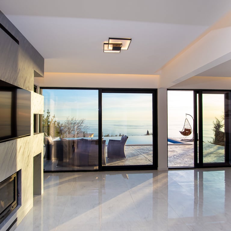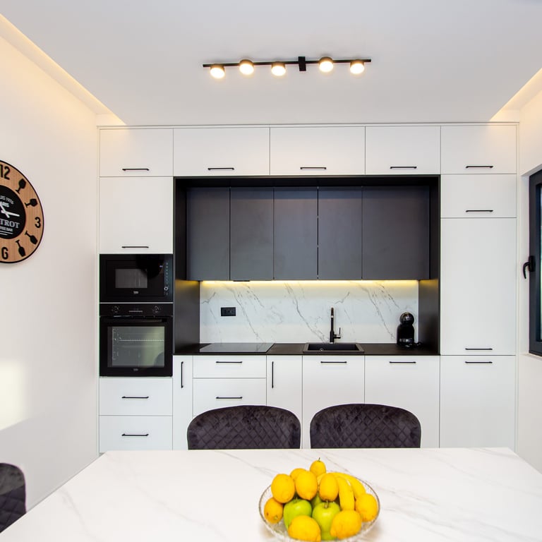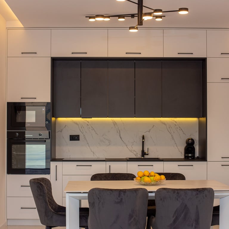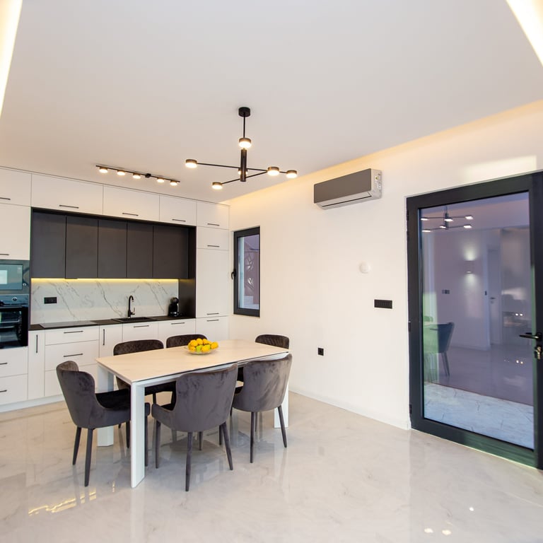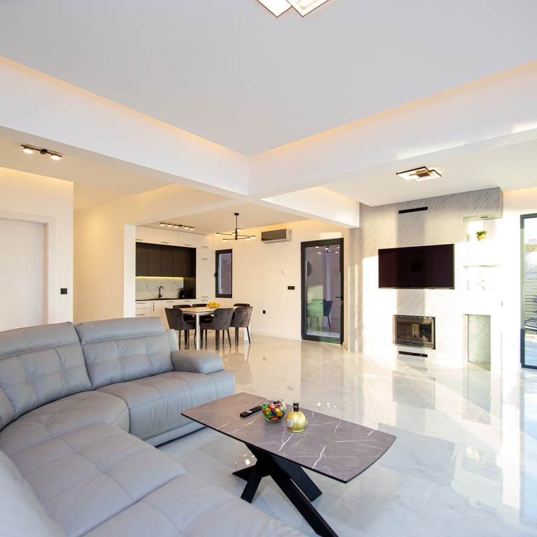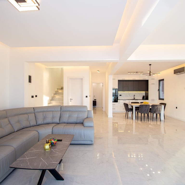 A spacious, open-plan living room seamlessly connected to a modern kitchen and dining area. Features comfortable seating, ample natural light, and a stylish dining table—perfect for relaxing, entertaining, and enjoying meals together
